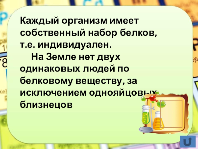 Слайд 13Каждый организм имеет собственный набор белков, т.е. индивидуален.