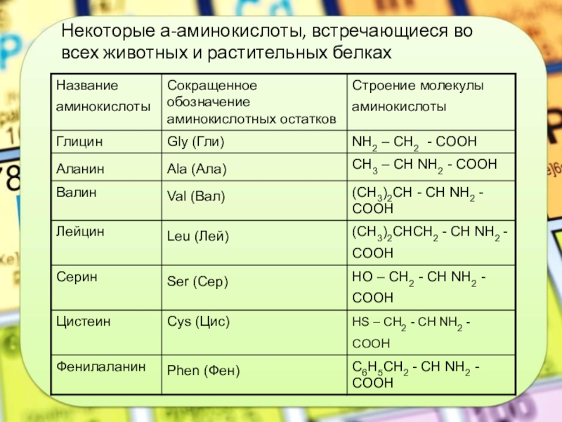 Слайд 11Некоторые а-аминокислоты, встречающиеся во всех животных и растительных белках