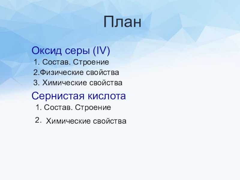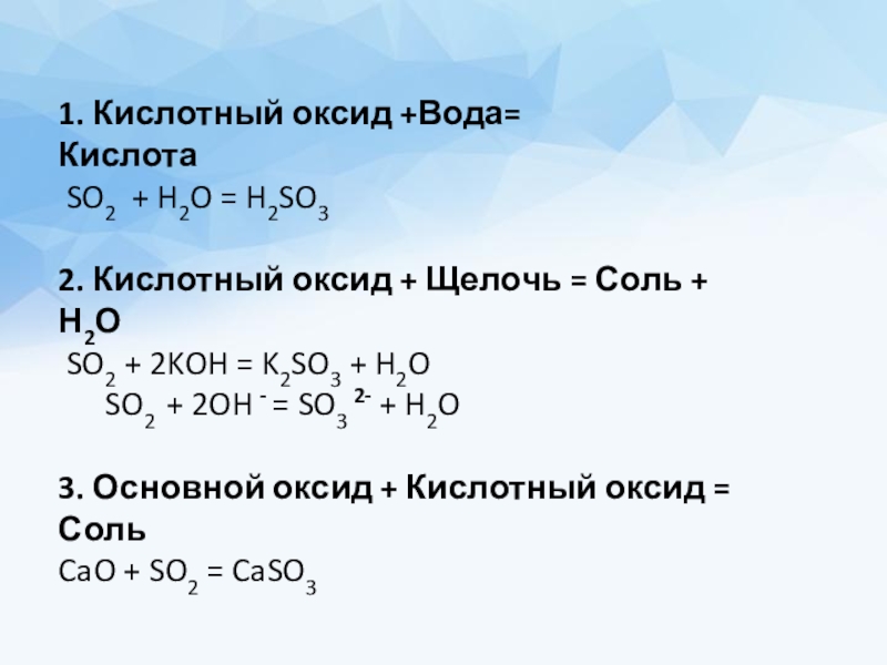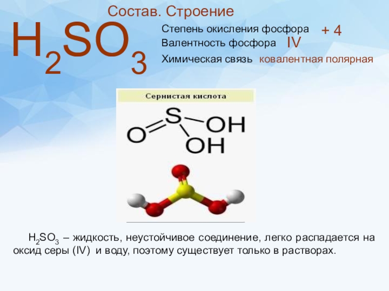 Н2SО3 – жидкость, неустойчивое соединение, легко распадается на оксид серы (IV) и воду, поэтому существует только в растворах.