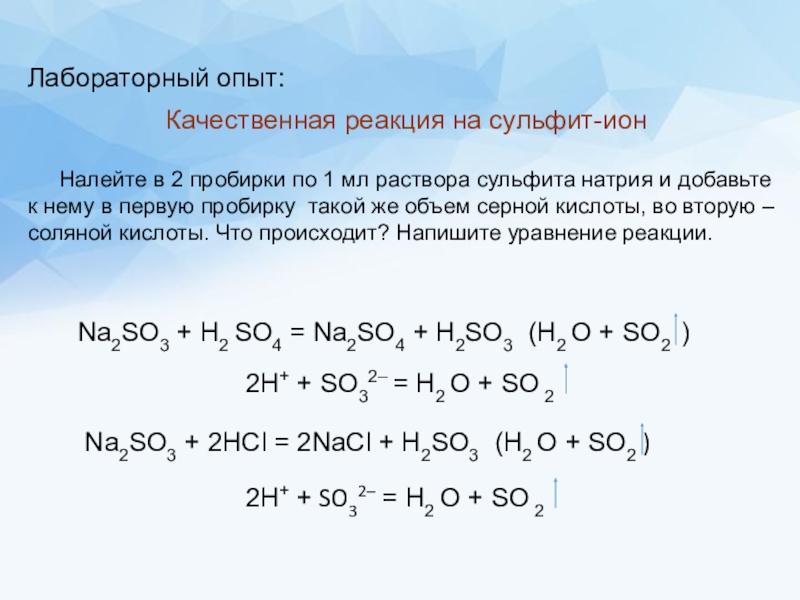 Na2SO3 + 2HCl = 2NaCl + H2SO3 (H2 O + SO2 )