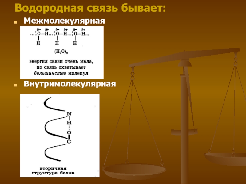 Водородная связь бывает:МежмолекулярнаяВнутримолекулярная