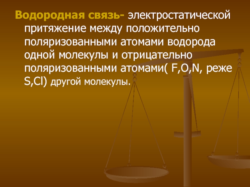 Водородная связь- электростатической притяжение между положительно поляризованными атомами водорода одной молекулы и отрицательно поляризованными атомами( F,O,N, реже
