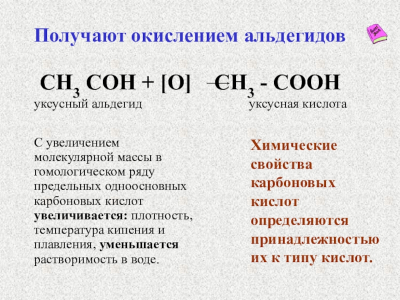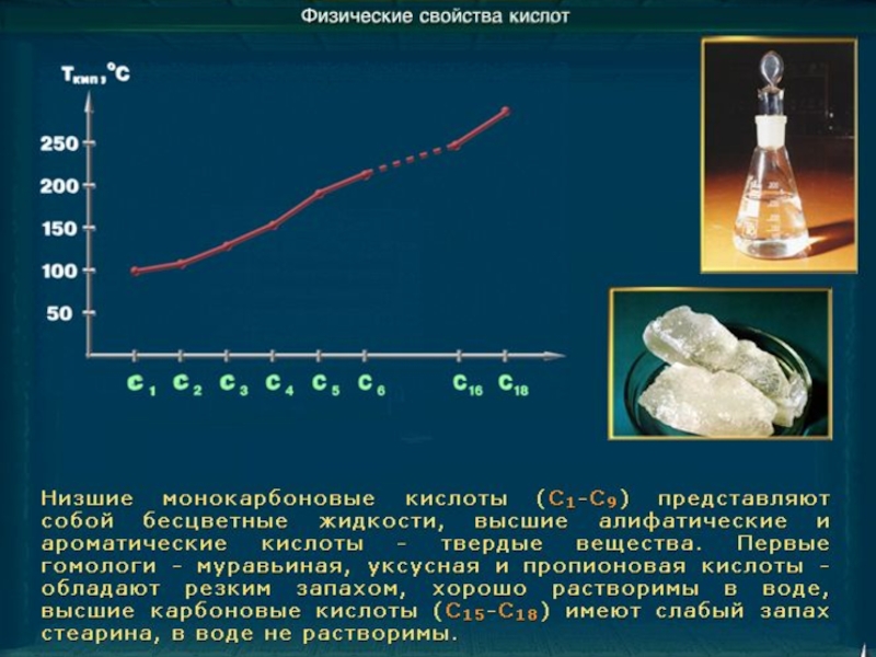 С увеличением молекулярной массы в гомологическом ряду предельных одноосновных карбоновых кислот увеличивается: плотность, температура кипения и плавления, уменьшается растворимость в воде.
