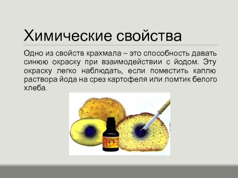 Химические свойстваОдно из свойств крахмала – это способность давать синюю окраску при взаимодействии с йодом. Эту окраску