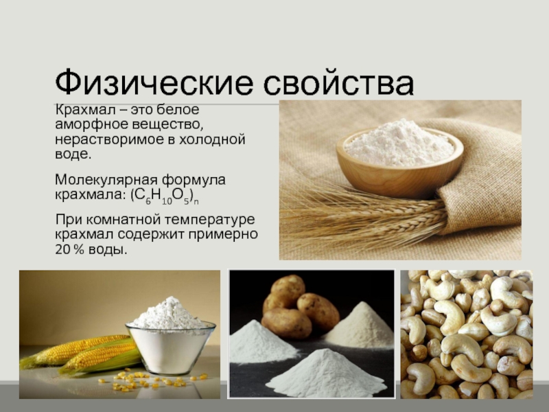 Физические свойства Крахмал – это белое аморфное вещество, нерастворимое в холодной воде. Молекулярная формула крахмала: (С6Н10О5)nПри комнатной