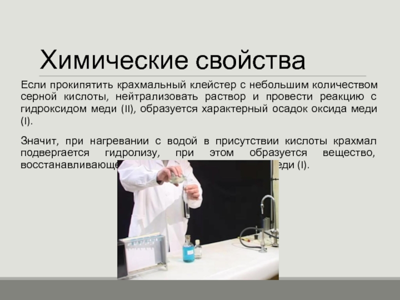 Химические свойстваЕсли прокипятить крахмальный клейстер с небольшим количеством серной кислоты, нейтрализовать раствор и провести реакцию с гидроксидом