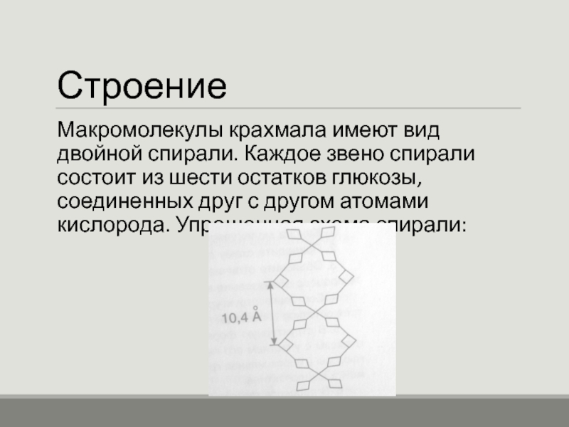 Строение Макромолекулы крахмала имеют вид двойной спирали. Каждое звено спирали состоит из шести остатков глюкозы, соединенных друг