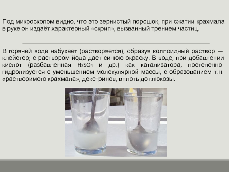 Слайд 5Под микроскопом видно, что это зернистый порошок; при сжатии крахмала в