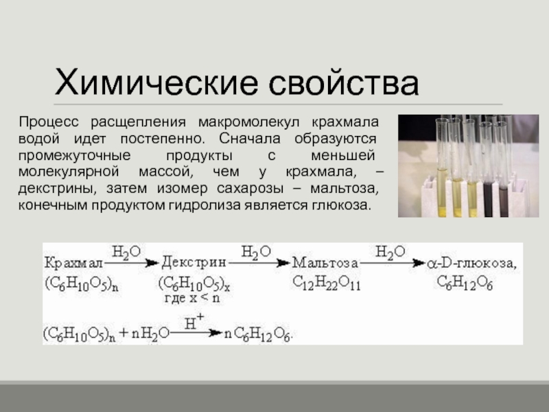 Химические свойстваПроцесс расщепления макромолекул крахмала водой идет постепенно. Сначала образуются промежуточные продукты с меньшей молекулярной массой, чем