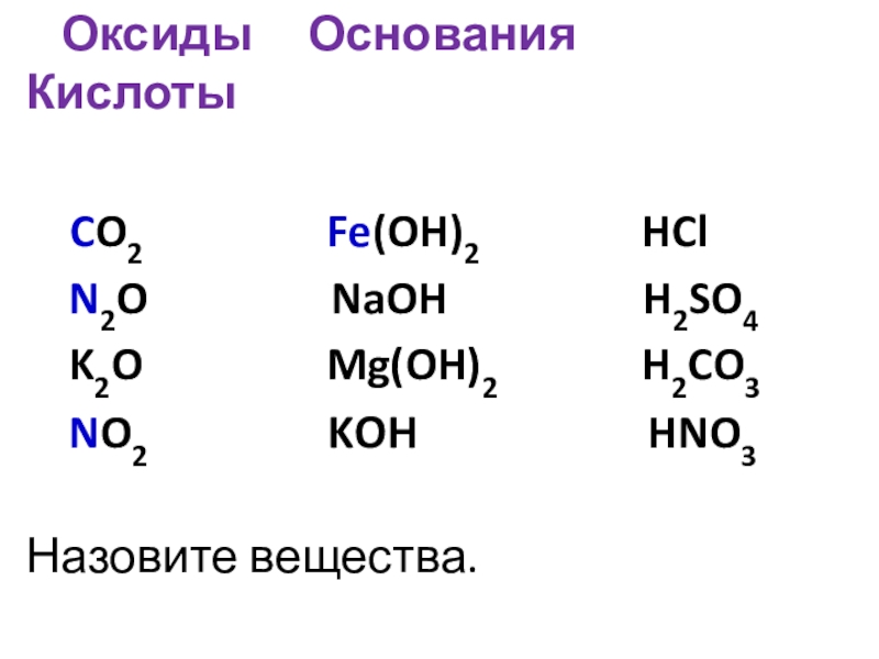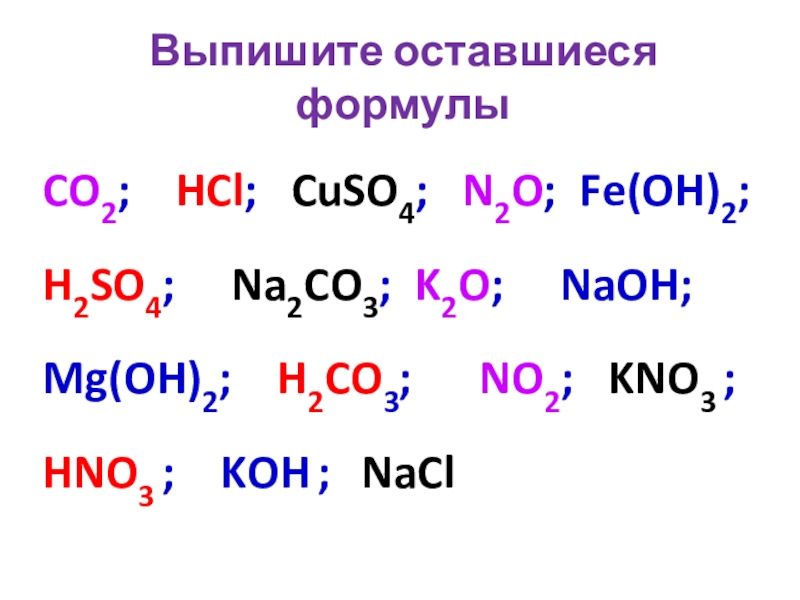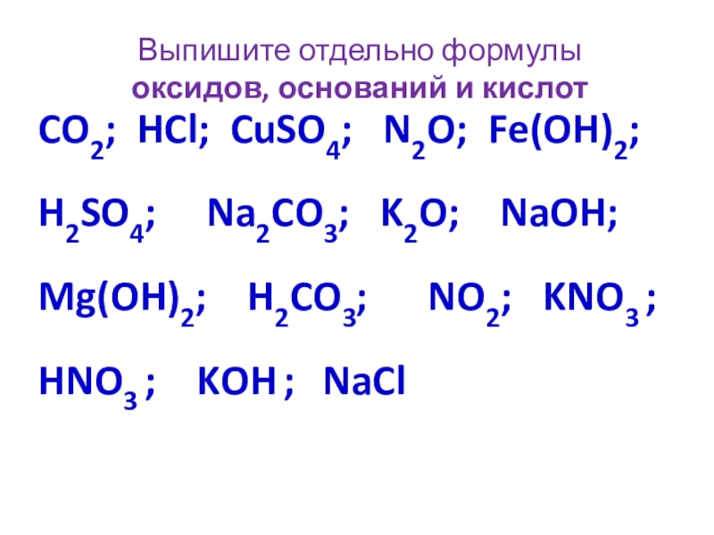 Слайд 2Выпишите отдельно формулы оксидов, оснований и кислот