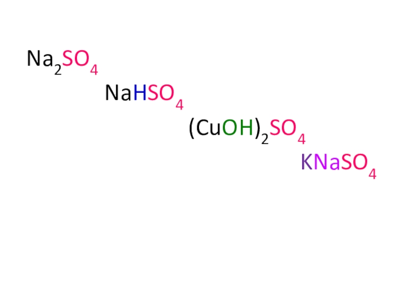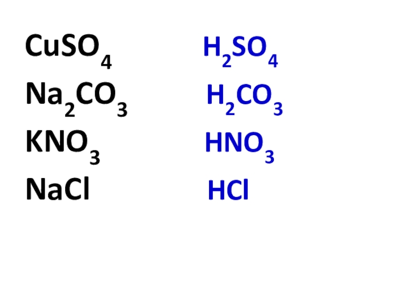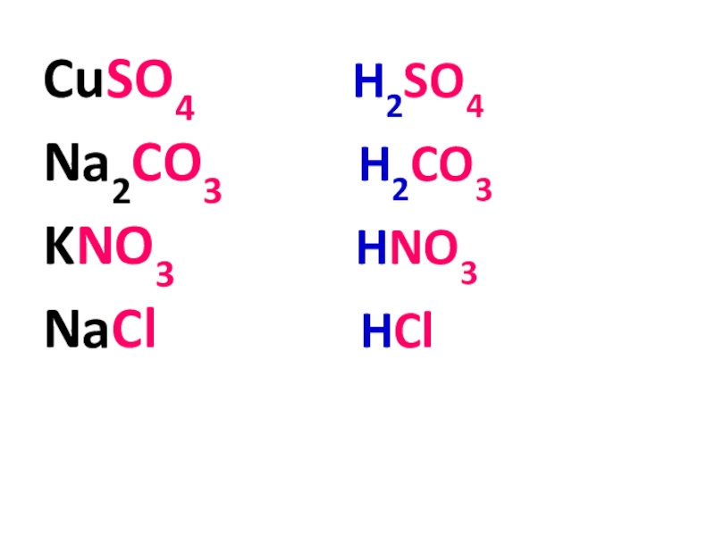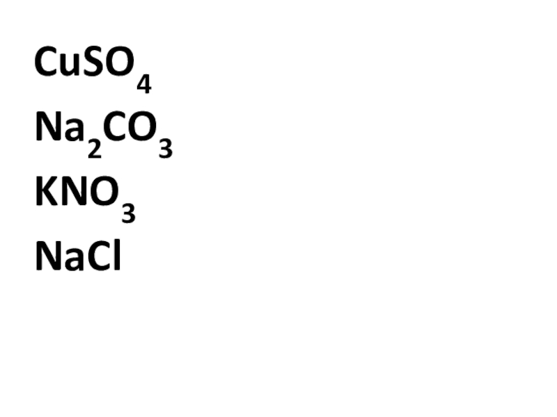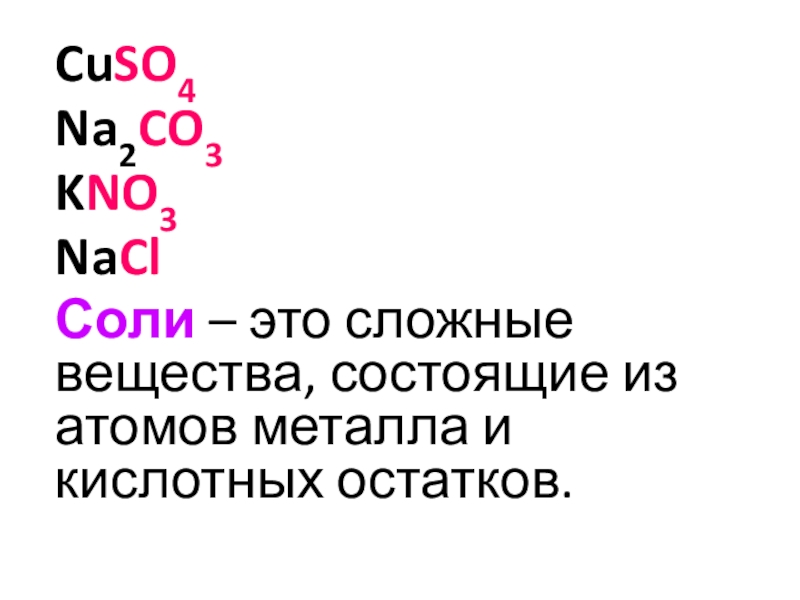 CuSO4        Na2CO3 KNO3NaClСоли – это сложные вещества, состоящие из атомов
