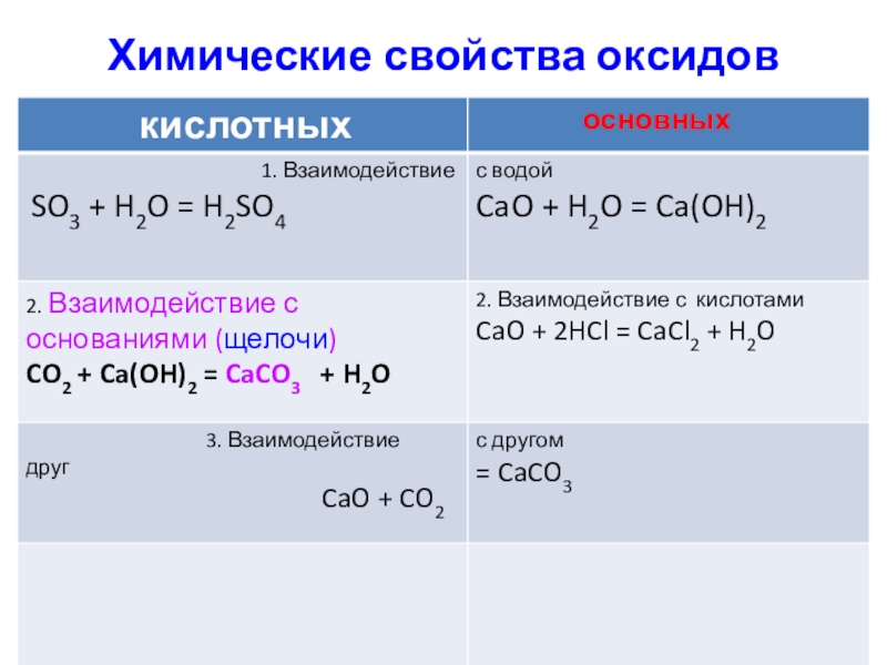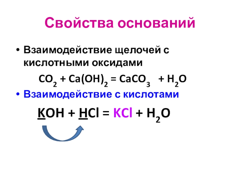 Свойства основанийВзаимодействие щелочей с кислотными оксидами     CO2 + Ca(OH)2 = CaCO3  +