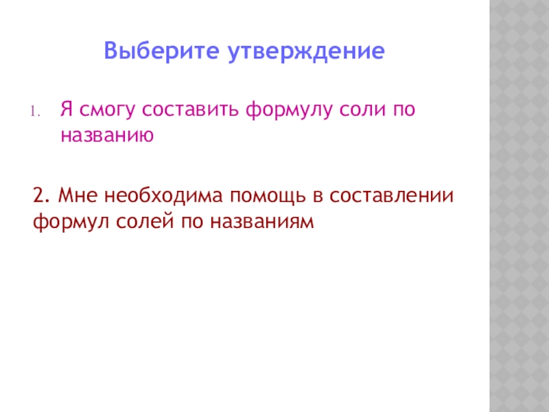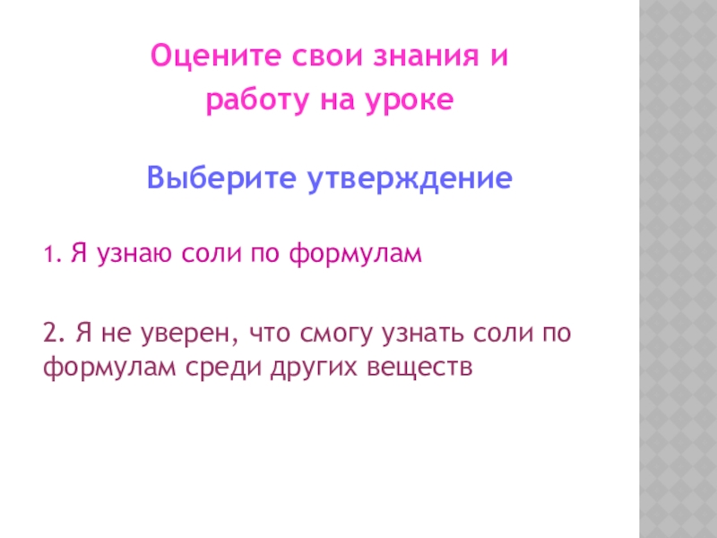 Оцените свои знания и работу на урокеВыберите утверждение1. Я узнаю соли по формулам2. Я не уверен, что