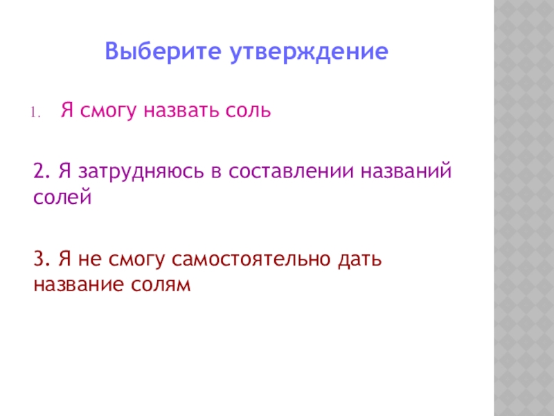 Выберите утверждениеЯ смогу назвать соль2. Я затрудняюсь в составлении названий солей3. Я не смогу самостоятельно дать название