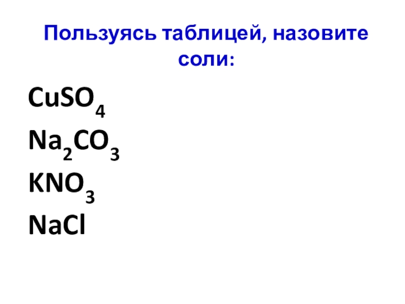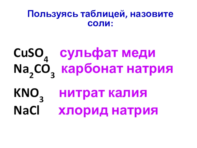 Пользуясь таблицей, назовите соли:CuSO4        Na2CO3 KNO3NaCl