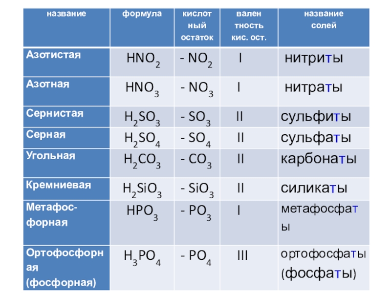 Пользуясь таблицей, назовите соли:CuSO4  сульфат меди       Na2CO3 карбонат натрияKNO3