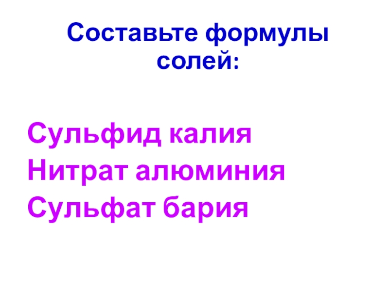 Составьте формулы солей:Сульфид калияНитрат алюминияСульфат бария