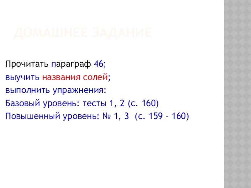 Домашнее заданиеПрочитать параграф 46;выучить названия солей;выполнить упражнения:Базовый уровень: тесты 1, 2 (с. 160) Повышенный уровень: № 1,