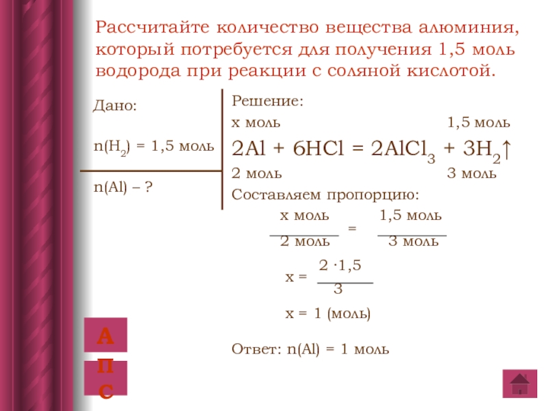 Рассчитайте количество вещества алюминия, который потребуется для получения 1,5 моль водорода при реакции с соляной кислотой.