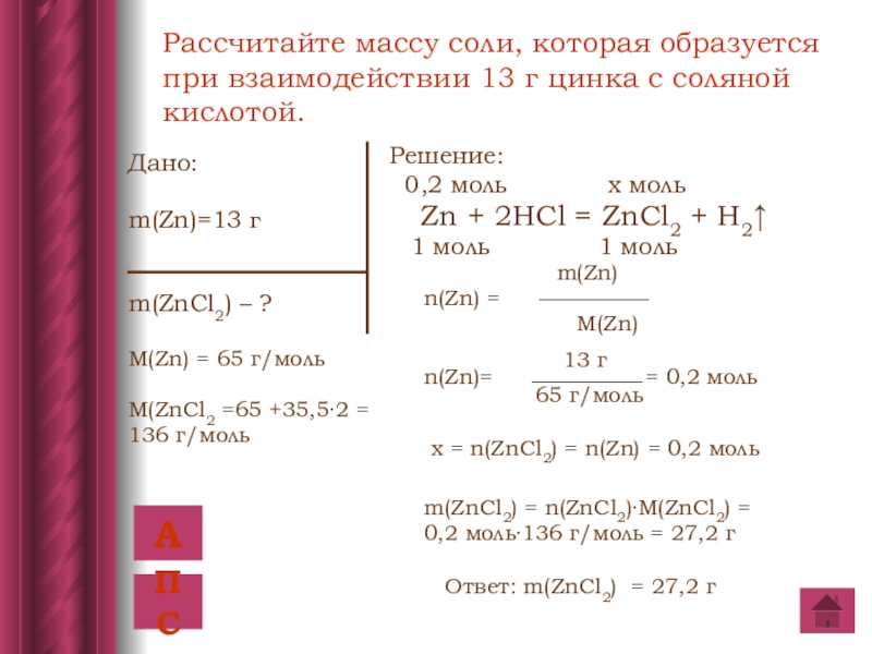Рассчитайте массу соли, которая образуется при взаимодействии 13 г цинка с соляной кислотой.