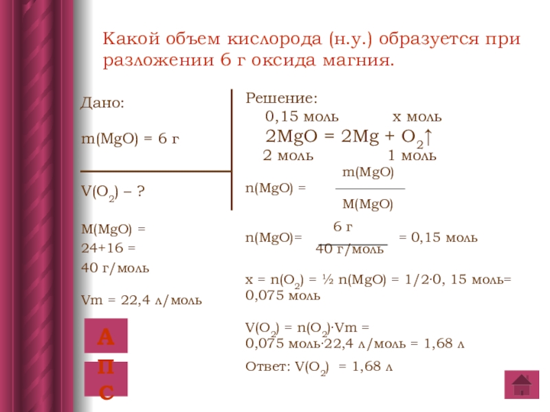 x = n(O2) = ½ n(MgO) = 1/2·0, 15 моль=