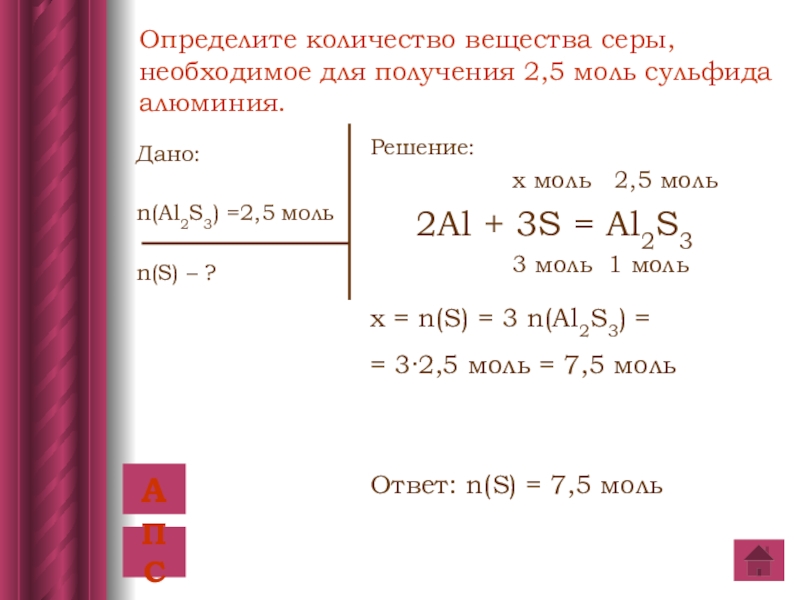 Определите количество вещества серы, необходимое для получения 2,5 моль сульфида алюминия.