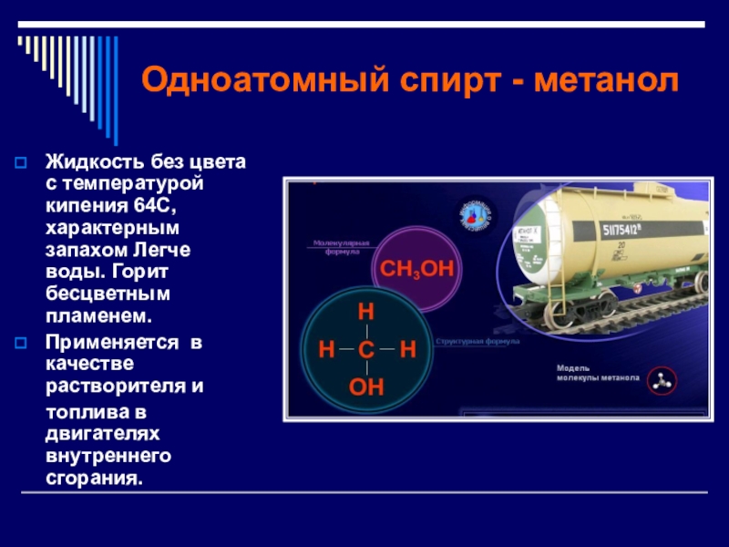 Слайд 10Одноатомный спирт - метанол