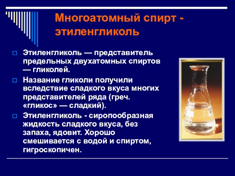 Этиленгликоль - сиропообразная жидкость сладкого вкуса, без запаха, ядовит. Хорошо смешивается с водой и спиртом, гигроскопичен.