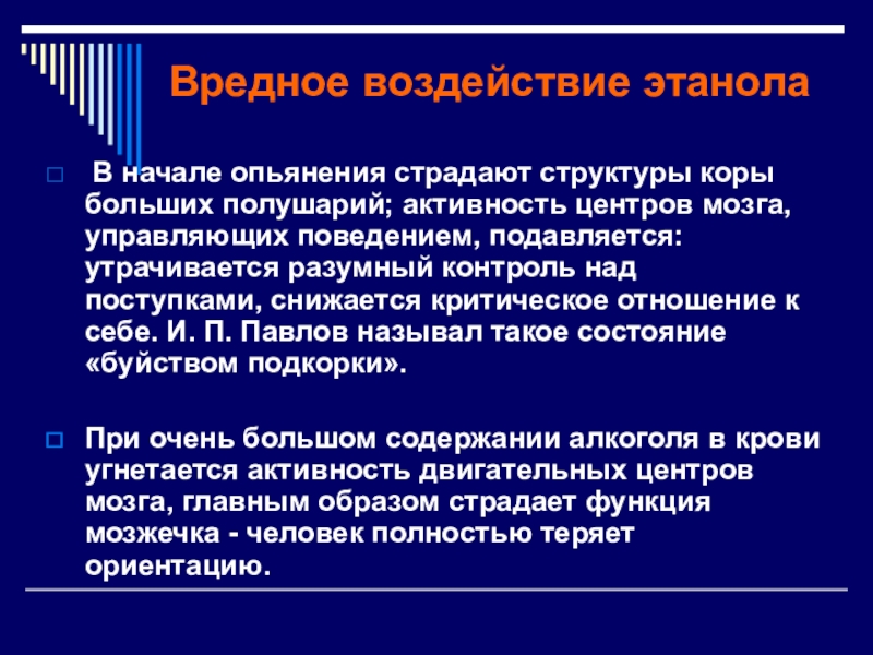 активность центров мозга, управляющих поведением, подавляется: утрачивается разумный контроль над поступками, снижается критическое отношение к себе. И. П. Павлов называл такое состояние «буйством подкорки».