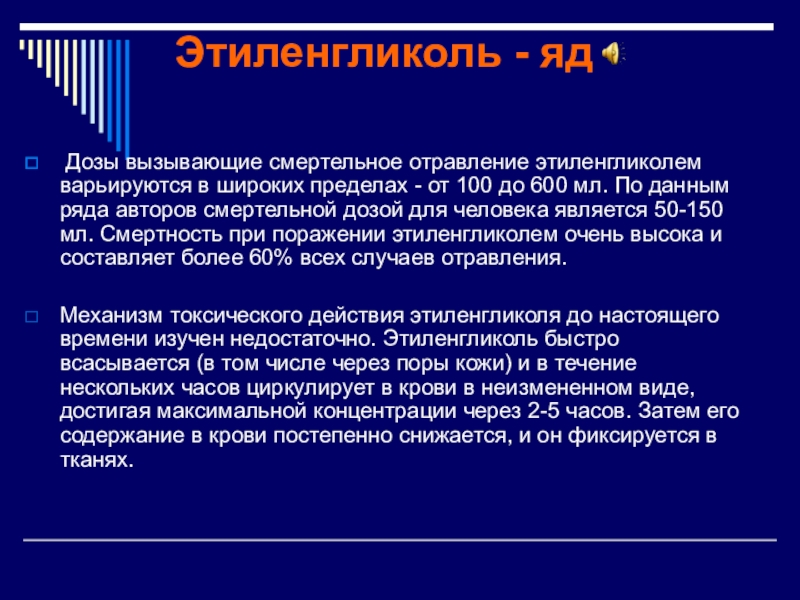 пределах - от 100 до 600 мл. По данным ряда авторов смертельной дозой для человека является 50-150 мл. Смертность при поражении этиленгликолем очень высока и составляет более 60% всех случаев отравления.