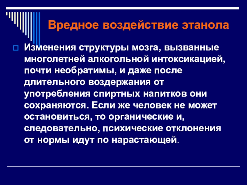 и даже после длительного воздержания от употребления спиртных напитков они сохраняются. Если же человек не может остановиться, то органические и, следовательно, психические отклонения от нормы идут по нарастающей.