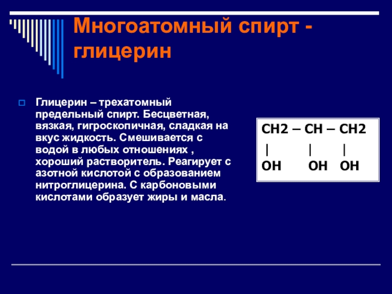 Глицерин – трехатомный предельный спирт. Бесцветная, вязкая, гигроскопичная,
