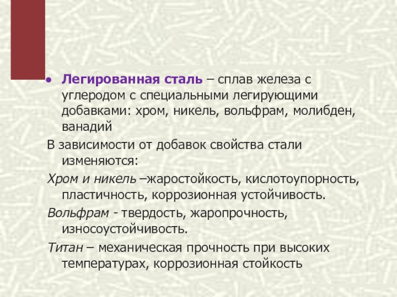 Слайд 16Легированная сталь – сплав железа с углеродом с специальными легирующими добавками: