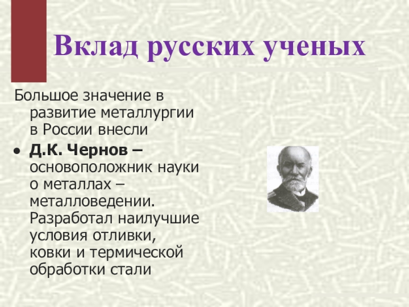 структуры стали, раскрыл секрет булатной стали, изобрел способ закалки стали в струе сжатого воздуха.