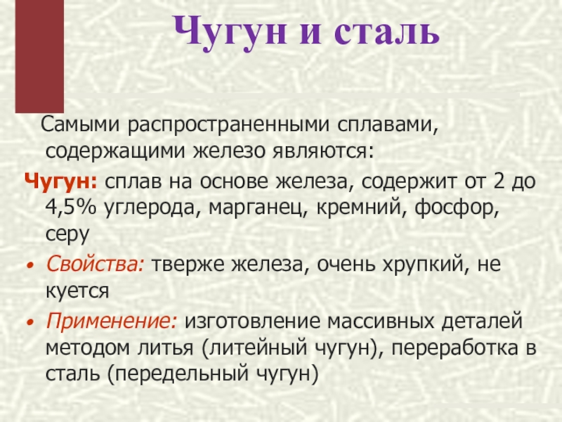 на основе железа, содержит от 2 до 4,5% углерода, марганец, кремний, фосфор, серу