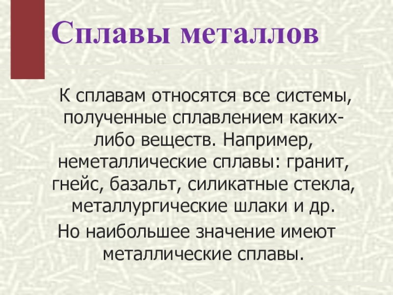 веществ. Например, неметаллические сплавы: гранит, гнейс, базальт, силикатные стекла, металлургические шлаки и др.