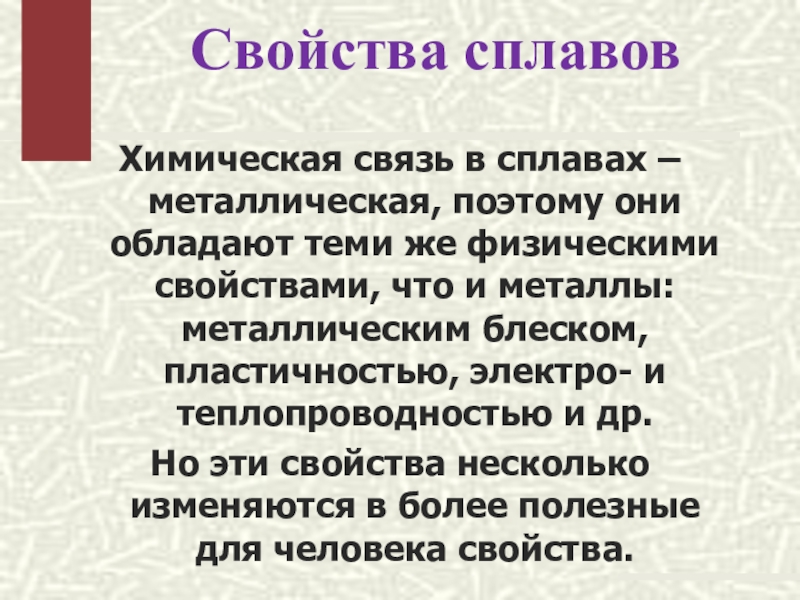 Химическая связь в сплавах – металлическая, поэтому они обладают теми
