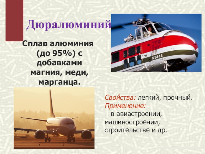 Сплав алюминия (до 95%) с добавками магния, меди, марганца.