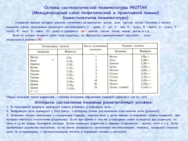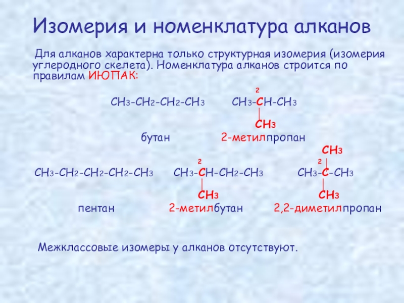 изомерия (изомерия углеродного скелета). Номенклатура алканов строится по правилам ИЮПАК: