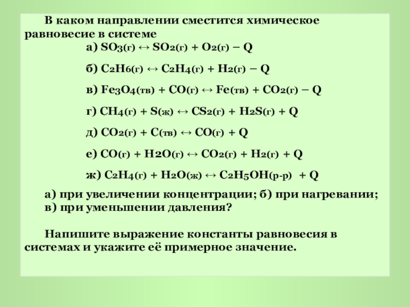 а) при увеличении концентрации исходных веществ равновесие смещается в сторону прямой реакции (вправо);