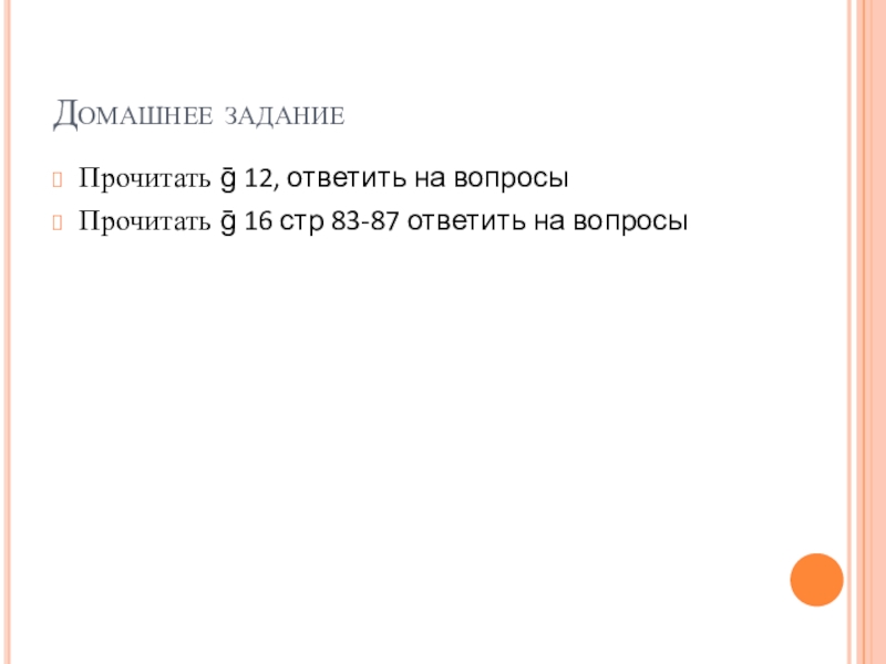 Домашнее заданиеПрочитать ḡ 12, ответить на вопросыПрочитать ḡ 16 стр 83-87 ответить на вопросы