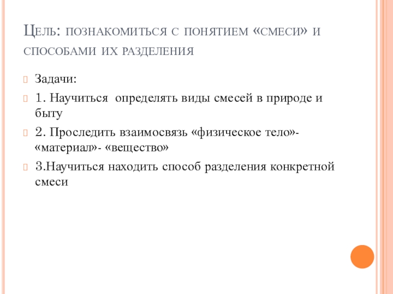 Цель: познакомиться с понятием «смеси» и способами их разделенияЗадачи:1. Научиться определять виды смесей в природе и быту2. Проследить взаимосвязь «физическое тело»- «материал»- «вещество»3.Научиться находить способ разделения конкретной смеси