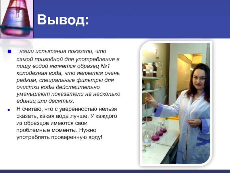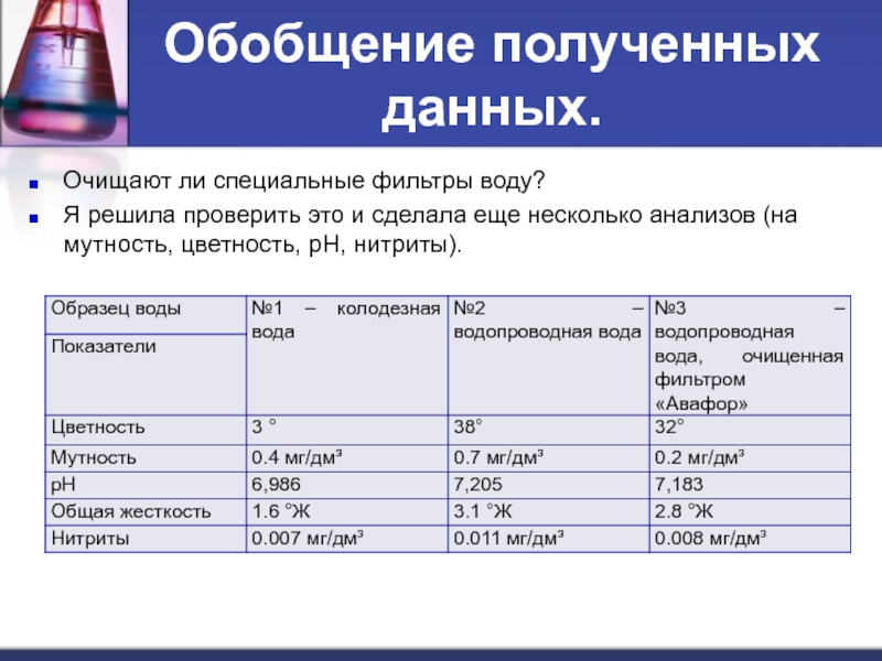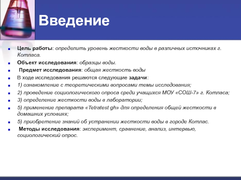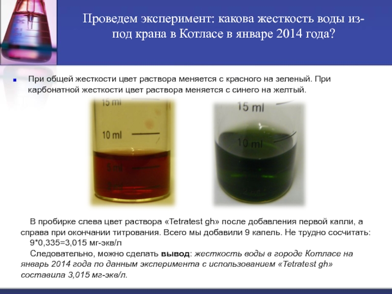 Следовательно, можно сделать вывод: жесткость воды в городе Котласе на январь 2014 года по данным эксперимента с использованием «Tetratest gh» составила 3,015 мг-экв/л.
