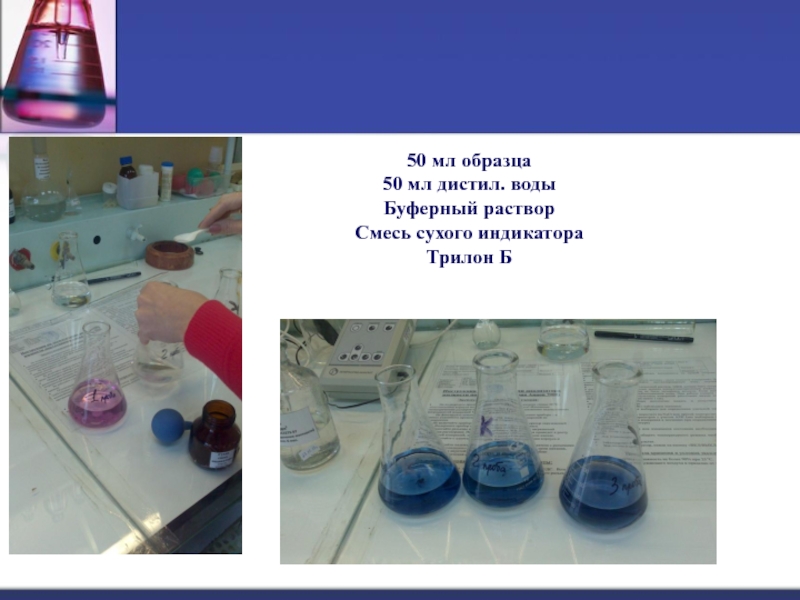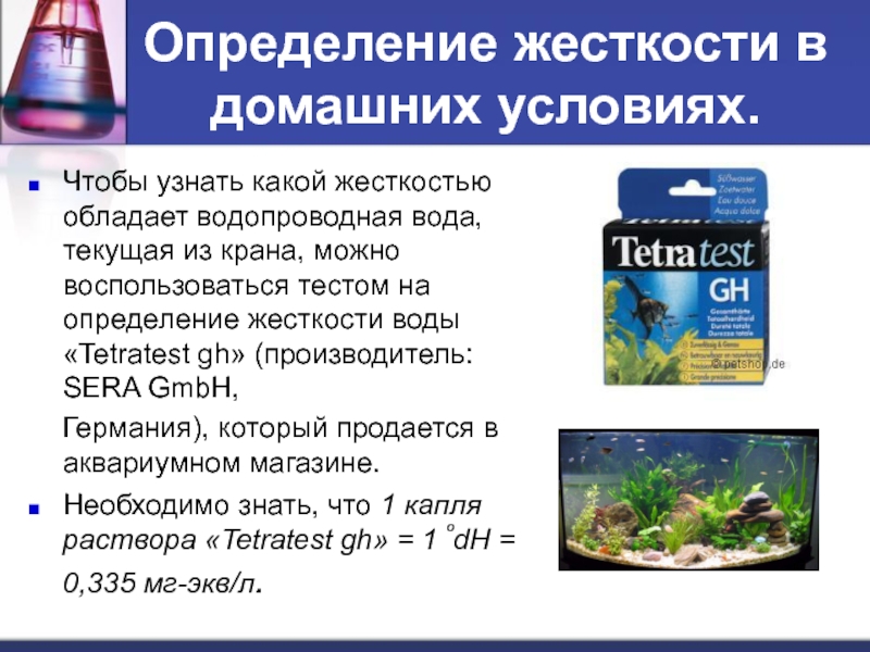 В пробирке слева цвет раствора «Tetratest gh» после добавления первой капли, а справа при окончании титрования. Всего мы добавили 9 капель. Не трудно сосчитать: