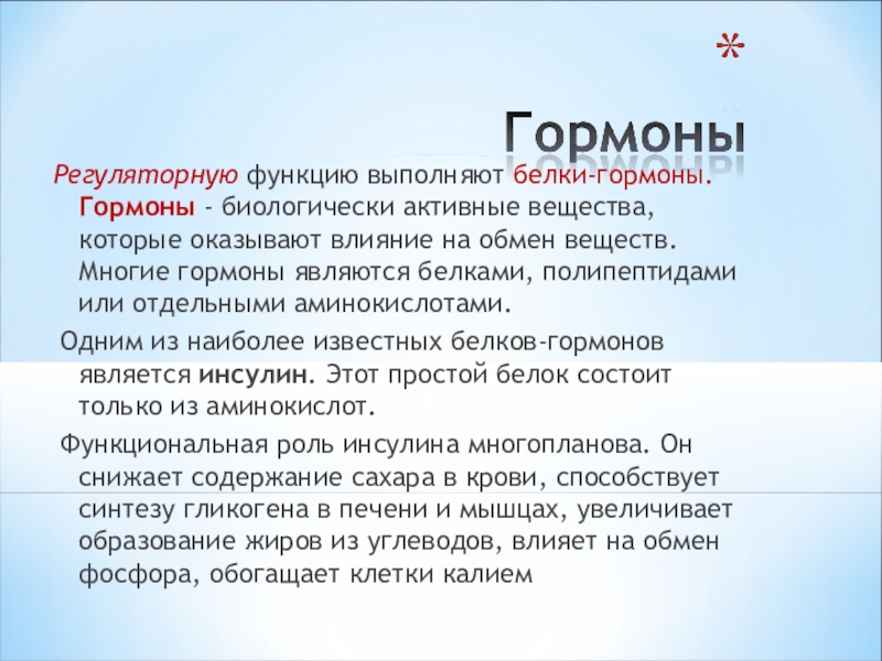 Слайд 28Регуляторную функцию выполняют белки-гормоны. Гормоны - биологически активные вещества, которые оказывают