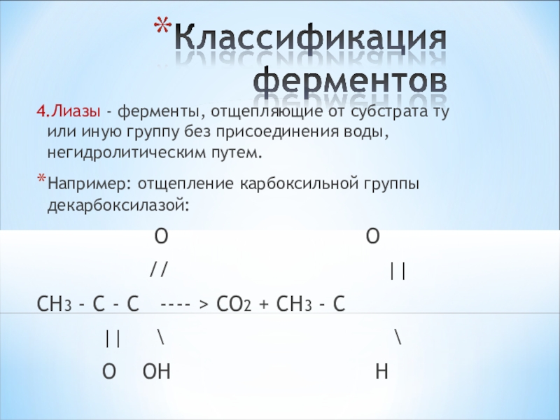 Слайд 264.Лиазы - ферменты, отщепляющие от субстрата ту или иную группу без