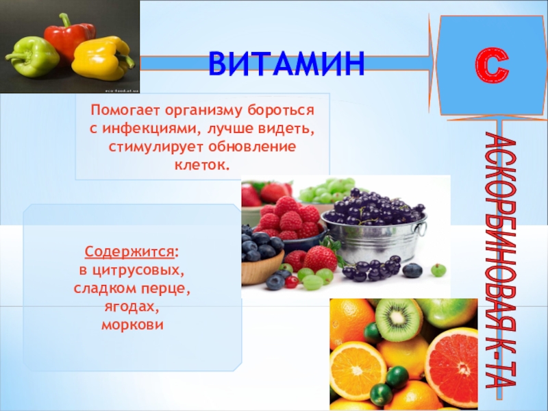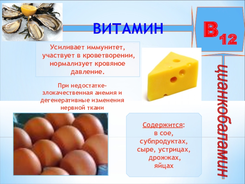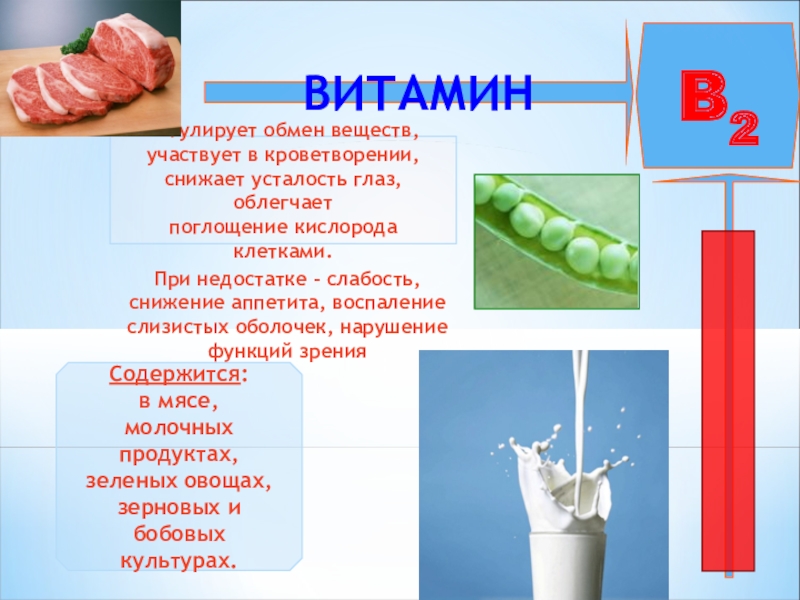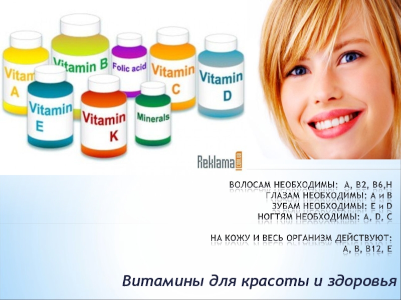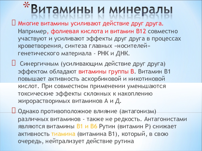 Слайд 20Многие витамины усиливают действие друг друга. Например, фолиевая кислота и витамин