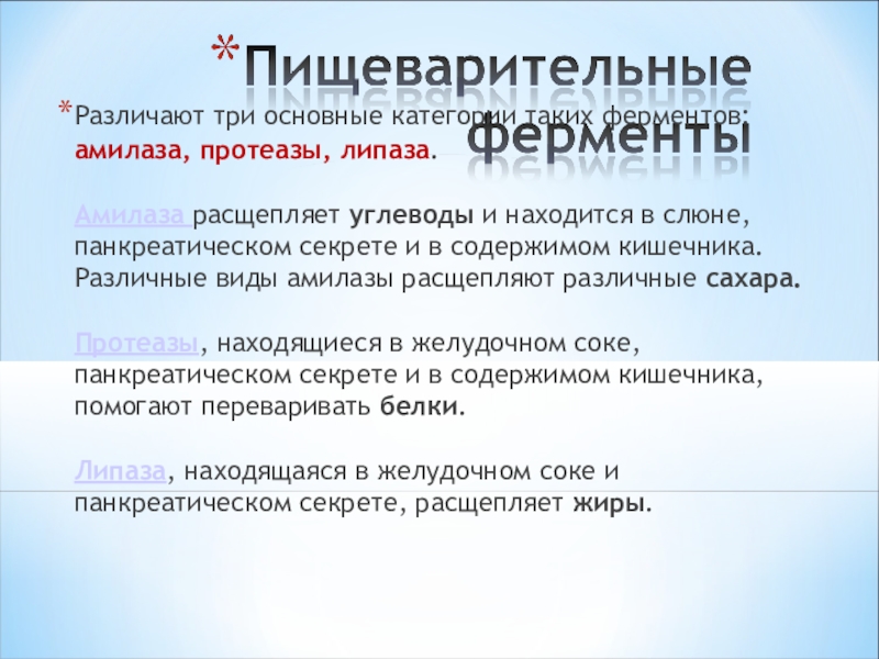 Слайд 22Различают три основные категории таких ферментов: амилаза, протеазы, липаза.