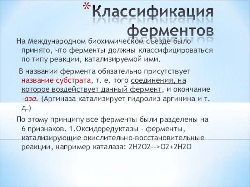 Слайд 24На Международном биохимическом съезде было принято, что ферменты должны классифицироваться по
