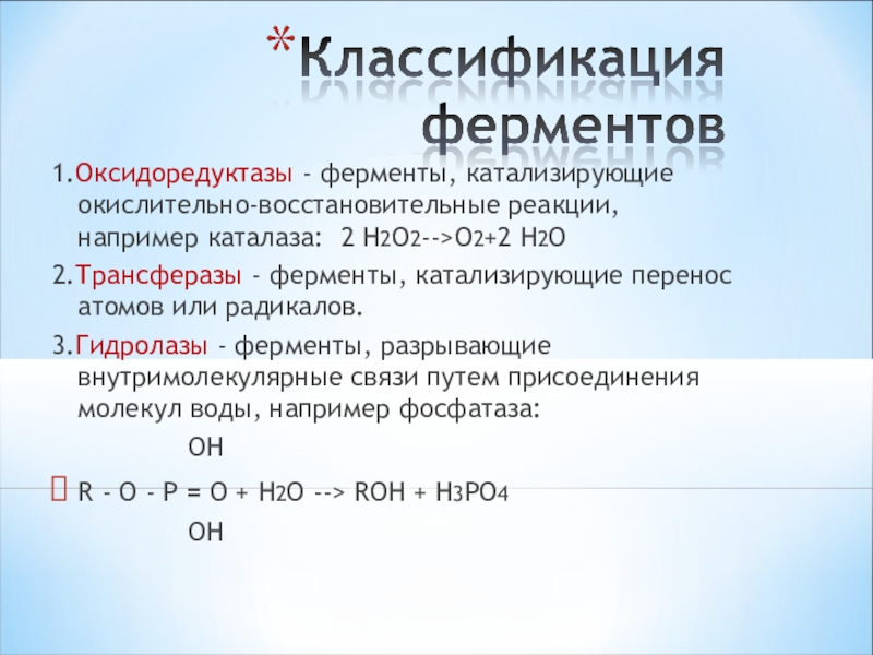 По этому принципу все ферменты были разделены на 6 признаков. 1.Оксидоредуктазы - ферменты, катализирующие окислительно-восстановительные реакции, например каталаза: 2H2O2-->O2+2H2O